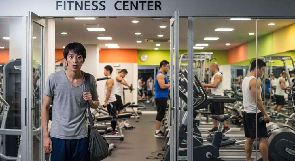 ガリガリ体型の男性がジムで周りの目を気にする様子